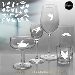 Glasmarkers mix bestaat uit 24 verschillende figuurtjes. Gemaakt van herbruikbare statische vinyl.