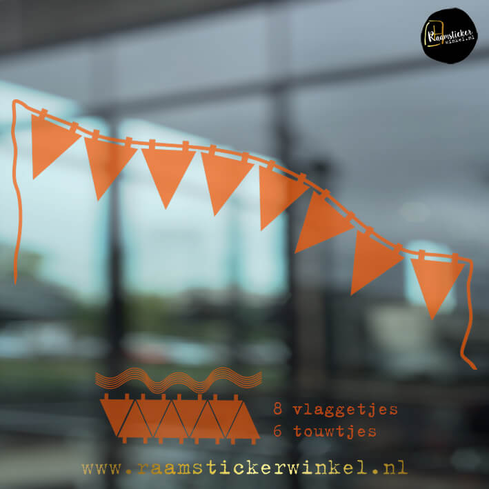 Koningsdag raamsticker oranje vlaggetjes van herbruikbare vinyl. Een mooie transparant oranje herbruikbare raamsticker. Te gebruiken voor Nederlandse feesten.